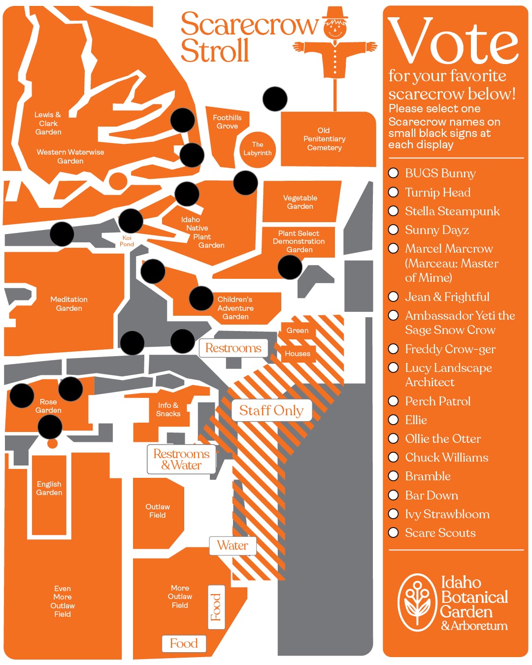 Use this map to explore all the creative scarecrows throughout the Garden! Vote for your favorites either directly on the map (just turn it in at the kiosk after your visit) or online using the QR code found on the map or on signage throughout the Garden. Don’t want to print one out? We’ve got you covered with copies at the Garden kiosk, just ask our staff!